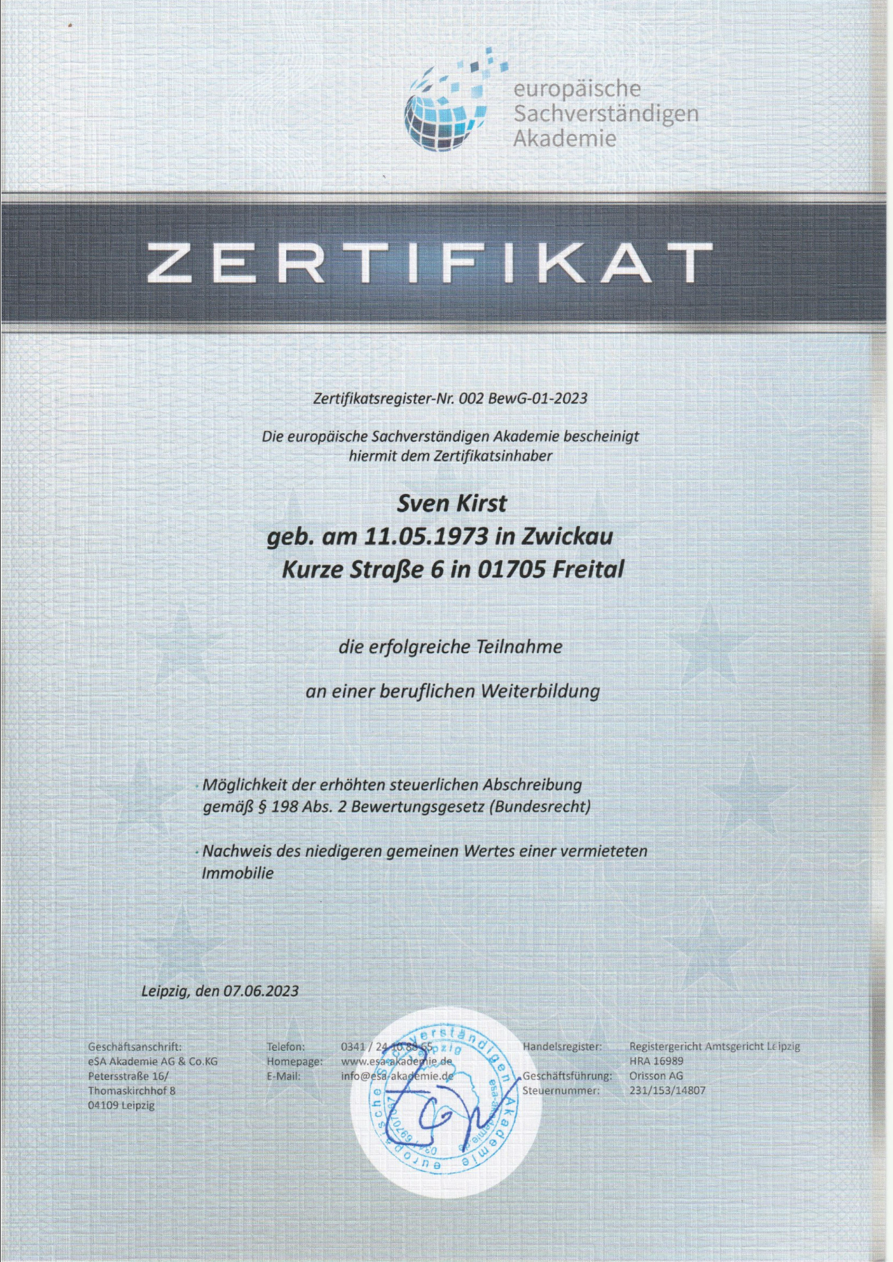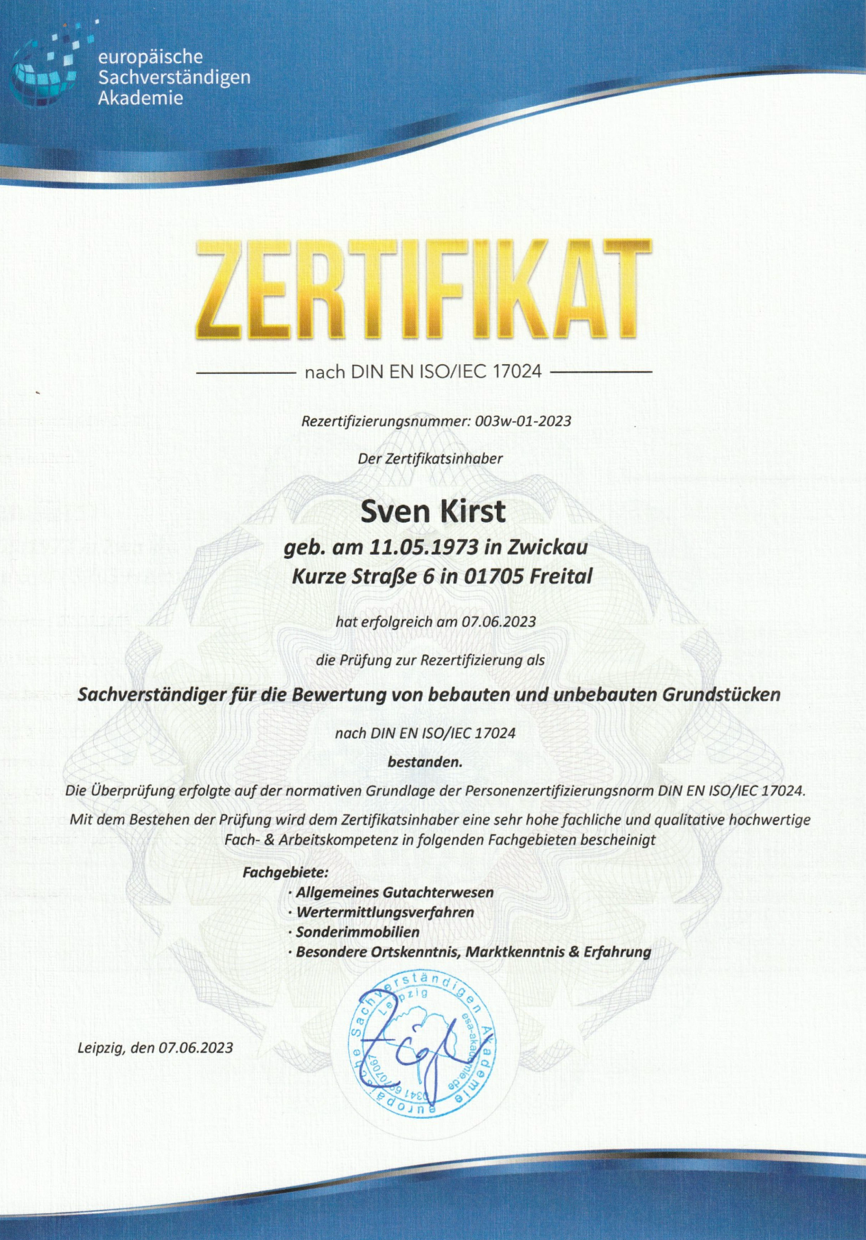 Zertifikate Im folgenden finden Sie einige Zertifikate, welche meine Eignung als Sachverständiger nachweisen.